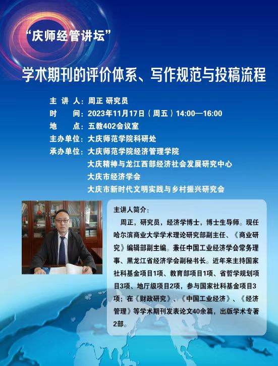 11月17日下午,哈尔滨商业大学学术理论研究部副主任、《商业研究》编辑部副主编、中国工业经济学会常务理事、黑龙江省经济学会副秘书长,周正研究员受邀做了题为《学术期刊的评价体系、写作规范与投稿流程》的专题讲座。讲座由必威西汉姆官网平台院长刘楠教授主持,大庆市经济学会、大庆市新时代文明实践与乡村振兴研究会会员,以及必威西汉姆官网平台全体专任教师参加。