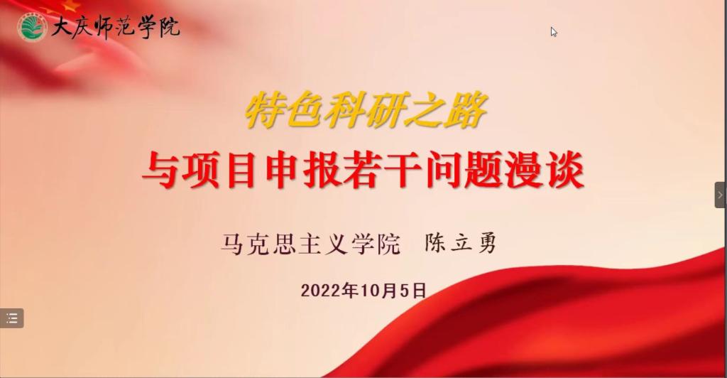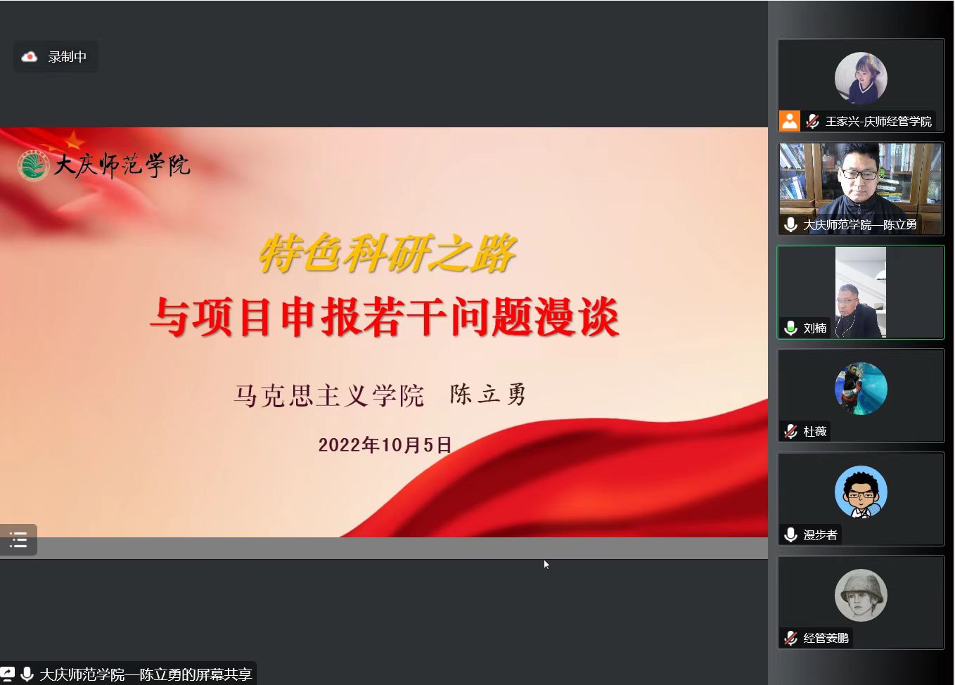 10月5日下午,黑龙江省哲学社会科学大庆精神研究基地副主任、大庆精神与龙江西部经济社会发展研究中心研究员、bw必威西汉姆联马克思主义学院陈立勇副教授受邀做了题为《特色科研之路与项目申报若干问题漫谈》的专题讲座。讲座采用线上腾讯会议形式,由必威西汉姆官网平台行政负责人刘楠教授主持,部分文科学院院长、科研副院长、教师以及经管学院全体教师等100余人参会。