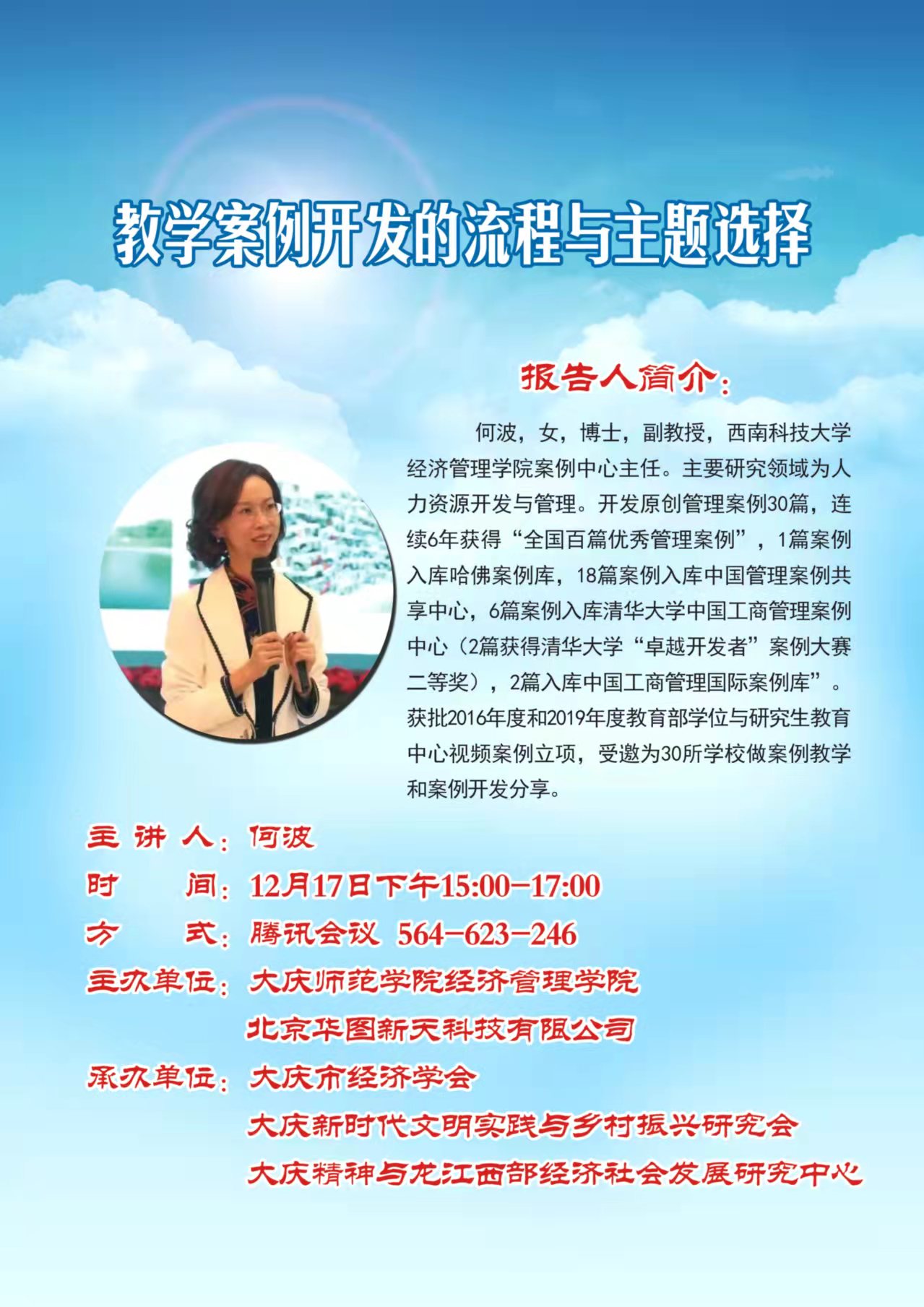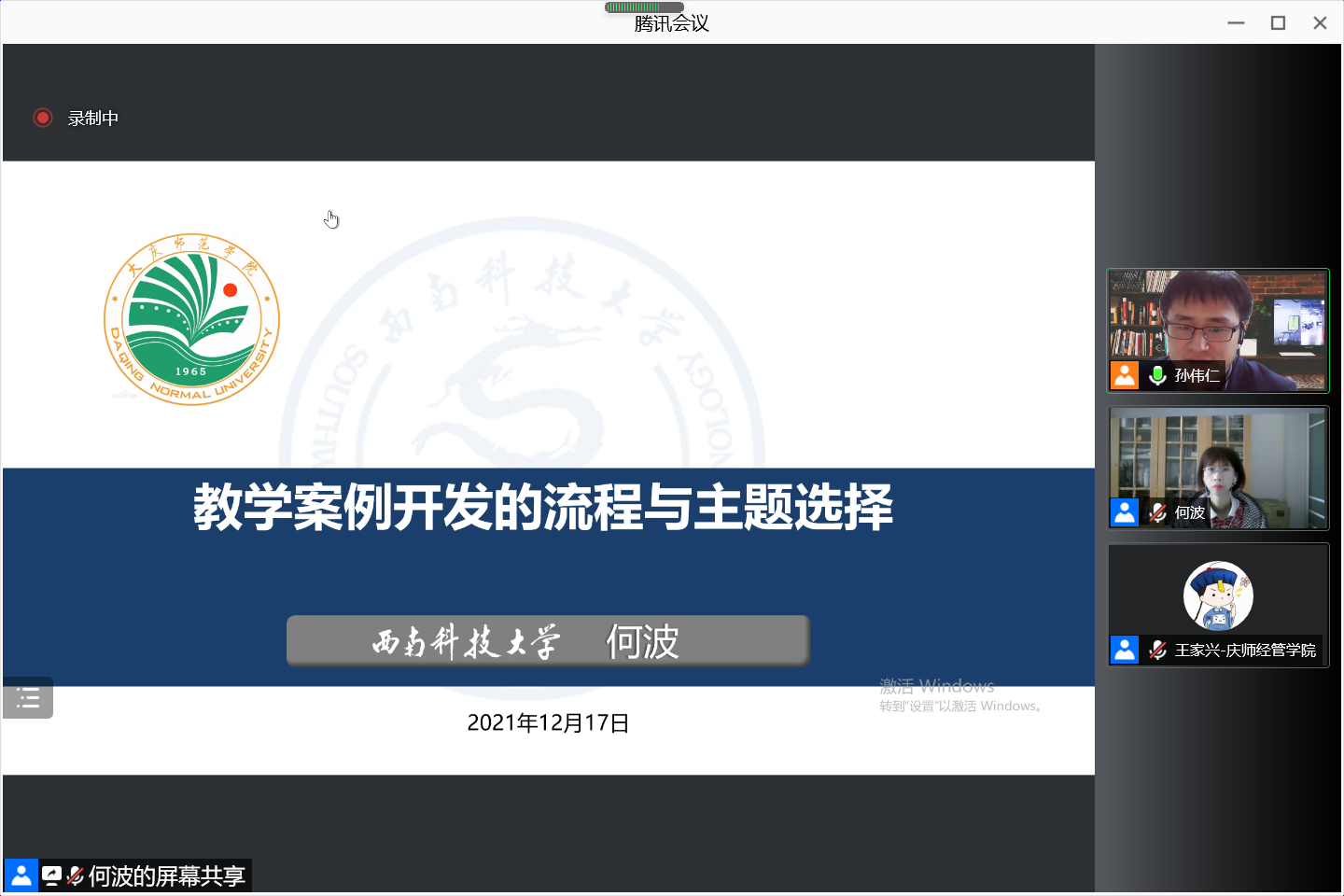 2021年12月17日下午,西南科技大学必威西汉姆官网平台案例中心主任何波博士受邀为我院做题为《教学案例开发的流程与主题选择》专题讲座。讲座采用腾讯线上会议形式,由必威西汉姆官网平台副院长孙伟仁主持,经管学院教师、文科学院部分教师参会,大庆市经济学会、大庆市新时代文明实践与乡村振兴研究会部分会员旁听。