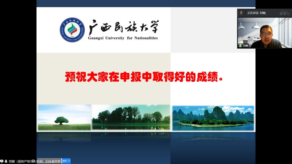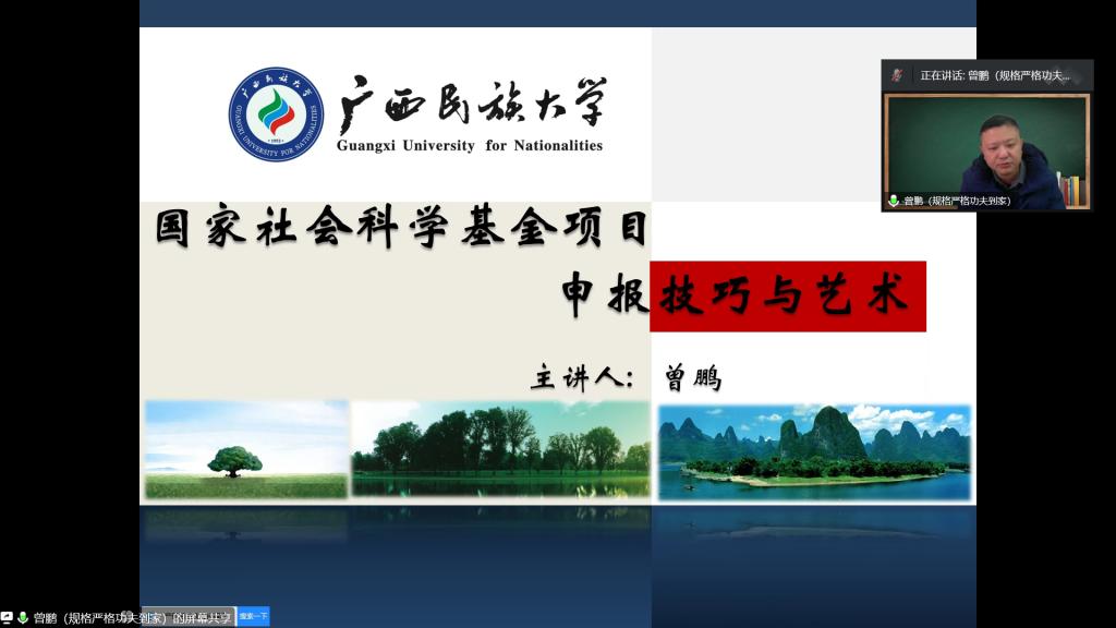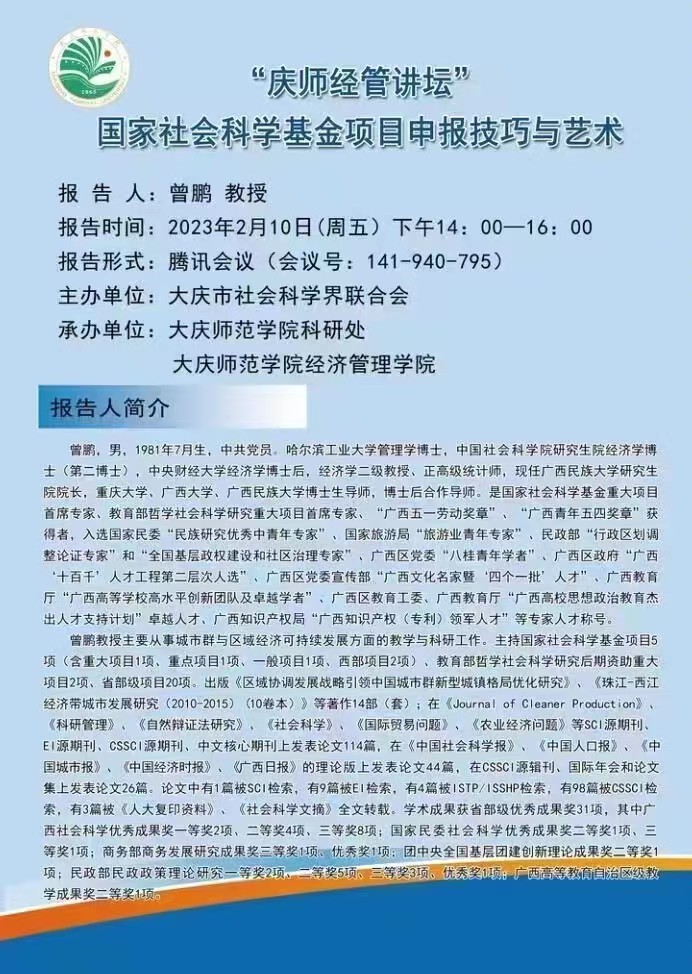 2月10日下午,广西民族大学研究生院院长,重庆大学、广西大学、广西民族大学博士生导师、博士后合作导师曾鹏教授受邀做了题为《国家社会科学基金项目申报技巧与艺术》的专题讲座。讲座采用线上腾讯会议形式,由必威西汉姆官网平台行政负责人刘楠教授主持,科研处领导、部分文科学院院长、科研副院长、教师以及经管学院全体教师等200余人参会。