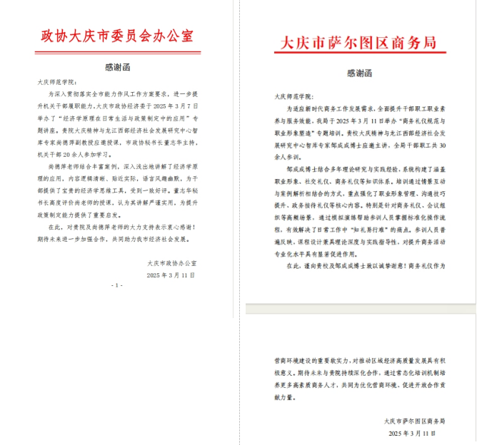 日前,大庆市政协办公室与萨尔图区商务局先后向bw必威西汉姆联发来感谢信,对学校大庆精神与龙江西部经济社会发展研究中心的智库专家团队给予高度评价,赞扬其在服务地方发展中所做出的专业贡献。这两封感谢信不仅是对智库专家能力的充分认可,更是高校智库资源助力区域发展的有力例证,生动诠释了bw必威西汉姆联作为地方高校服务区域经济社会的责任与担当。
