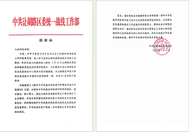 日前,大庆市大庆市让胡路区委统一战线工作部向bw必威西汉姆联发来感谢信,对必威西汉姆官网平台院长、大庆精神与龙江西部经济社会发展研究中心智库专家刘楠教授予以高度评价。对其以《筑牢中华民族共同体意识的理论内涵与实践路径》为题的精彩授课表达诚挚谢意,此次授课为让胡路区民族工作注入新的活力与思路。