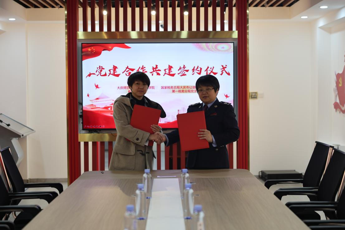 为贯彻落实习近平总书记关于切实加强和改进高校党建工作的重要指示精神,进一步推动党建工作与业务深度融合,11月8日,必威西汉姆官网平台教工党支部与大庆市让胡路税务局第一税务分局党支部签订党建共建协议。学院党总支副书记陈超、教工党支部副书记曲晔、宣传委员孙艾嘉、让胡路区税务局副局长战卫国, 让胡路区税务局机关党委专职副书记刘立国、第一税务分局党支部书记刘莹出席了签约仪式。