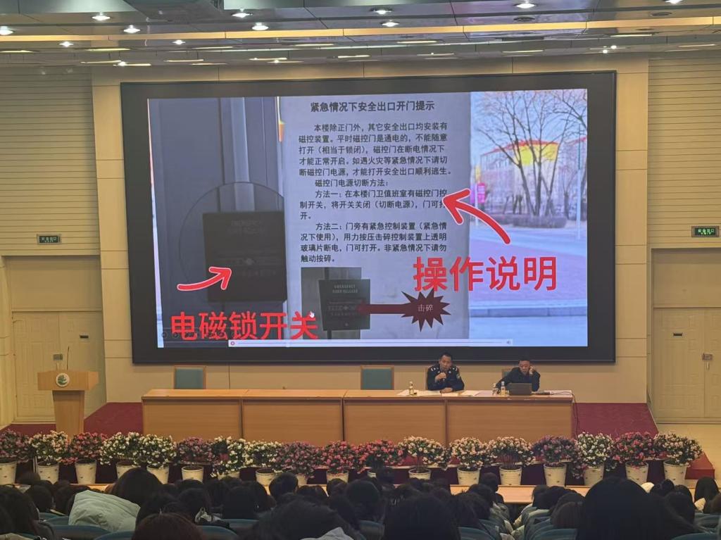 随后,盖处长转向校园消防安全主题,通过视频演示呈现火灾发生时逃生窗、防火门、护栏的规范使用方法。他重点强调火场逃生不贪恋财物、冷静判断疏散路线等自救要点,引导师生将消防安全知识内化于心、外化于行,共同守护校园安全。