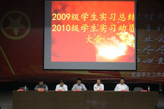 最后,孔若东书记以轻松幽默的话语跟大家分享了自己对于成功的理解以及对大家的期盼并对2009级实习进行总结和赞扬;动员2010级学生积极参与实习工作要有不怕苦不怕累的精神,给学生送去了成功就业的期许与祝福。