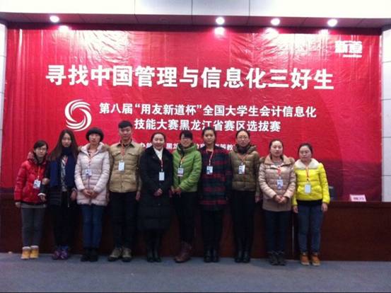 由黑龙江省教育厅高等教处主办,教育部全国高等学校学生信息咨询与就业指导中心支持,用友新道科技有限公司承办的“寻找中国管理与信息化三好生”暨第八届“用友杯”全国大学生会计信息化技能大赛决赛(含省赛与国赛)2014年11月29日进行决赛,决赛共收到来自全国631多所高校的915支队伍报名,共计3660名参赛学生。黑龙江省共27所院校,91支队伍,364名学生参赛。