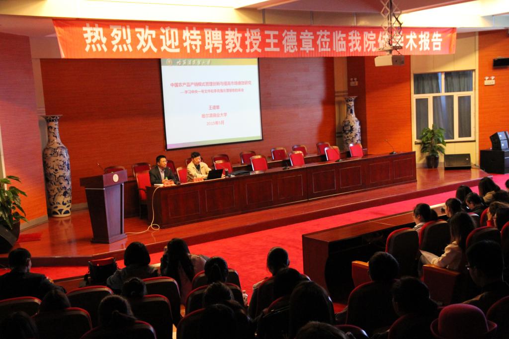 5月6日下午,原哈尔滨商业大学副校长、博士生导师、我校特聘教授王德章在博雅讲堂为我院全体师生作题为《中国农产品产加销一体化营销与提高市场绩效研究》的学术报告。王教授结合中央一号文件和李克强总理讲话,以农产品营销模式创新和提高市场绩效为切入点,分析了推进农产品产加销一体化营销模式创新的重要性,以及如何提高市场绩效等问题。报告会由必威西汉姆官网平台张平院长主持,我院全体教师及2014级全体学生参加本次报告会。
