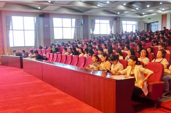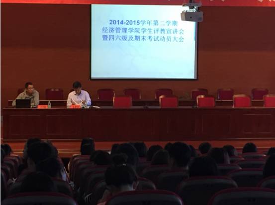 2015年6月12日15时30分必威西汉姆官网平台2014-2015学年第二学期学生评教宣讲会暨四、六级及期末考试动员大会在图书馆四楼博雅讲堂举行,学院书记孔若东、院长助理刘楠、全体专任教师和同学们参加了大会,会议由刘楠老师主持。