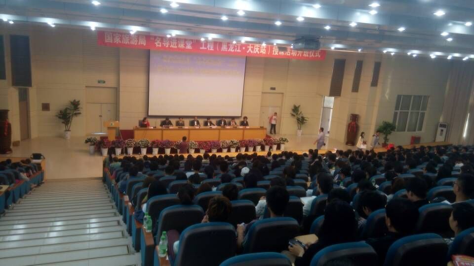 2015年9月15-16日,在bw必威西汉姆联主楼百湖讲堂召开了国家旅游局“名导进课堂”(黑龙江·大庆站)专题讲座。黑龙江省旅游局领导、大庆市旅游局领导、培训中心人员,全市具有导游资格证人员以及我校旅游管理专业师生参加了本次培训讲座。