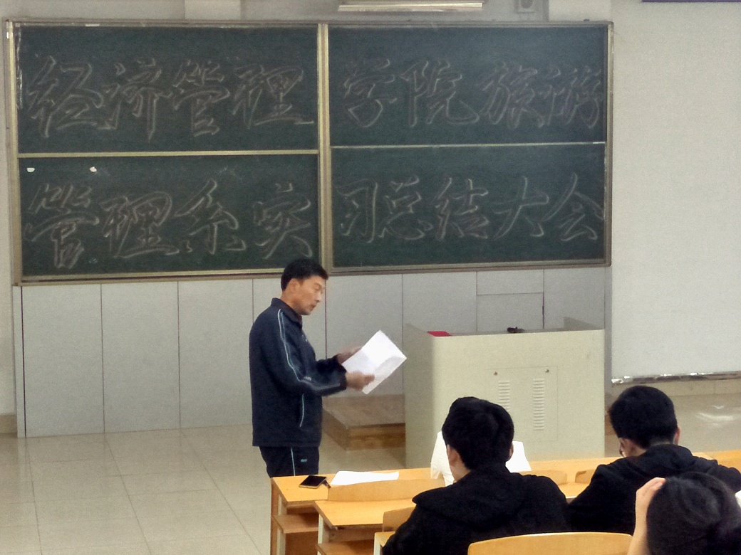 会上,车主任对此次实习做了简要的总结,明确了各个实习单位和实习计划时间表,并展示了部分同学所获得的表扬信。随后,每个实习单位小组派代表讲话,以PPT演讲的方式,围绕实习工作和生活,给同学们和2016级的学弟学妹们分享了自己的心得体会和经验。各小组讲话都十分精彩,真实的表达了自己对于实习的感悟。接下来,则是对8位优秀实习生代表进行嘉奖,酒店管理专业5名,旅游管理专业3名,鼓励各位同学再接再厉,越来越优秀。最后刘楠院长就此次总结大会发表讲话,衷心的感谢车鑫老师和历届学长学姐们为后来的同学们搭建的实习平台,对实习生代表的讲话提出表扬,并给同学们提出建议,希望同学们能明确目标,注意职业目标的选择。孔若东书记同样表达了对于实习生们的赞美,也希望同学们能够珍惜机会,提高自己的能力。