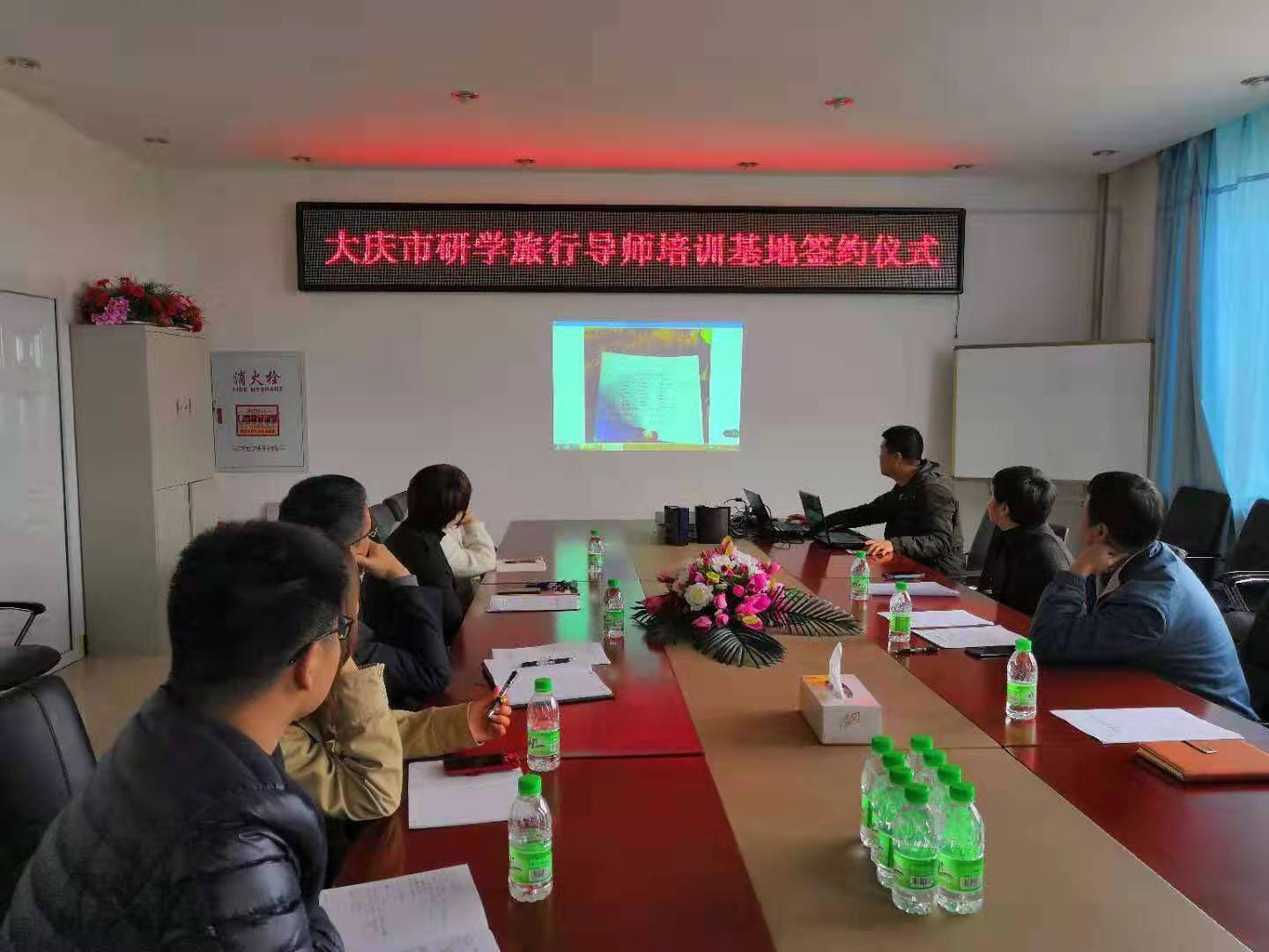 2019年10月28日上午9点,“大庆市串联行知研学指导教师培训基地”签约授牌仪式在我院会议室举行,刘楠院长、行知研学教育公司郭总、研学导师张孟楠、大庆广电旅行社初总参加签约仪式。仪式由旅游管理系主任车鑫主持,旅游管理系骨干教师参与讨论。