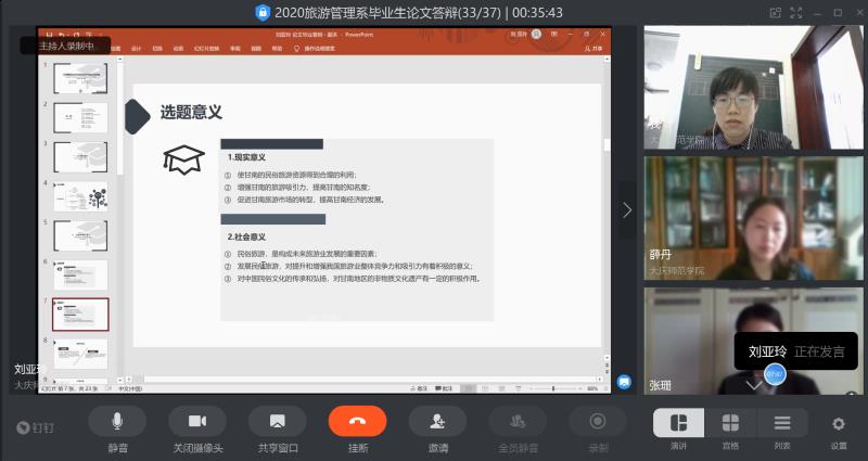 由于疫情尚未结束,本次2020届毕业论文答辩工作采用线上方式进行,这对于毕业生和答辩教师来说都是新的挑战。因此旅游管理系很早就开始布置答辩工作,安排答辩组长尝试不同的会议软件,最终选定最适合自己硬件设备和网络环境的答辩方式。每个答辩组开始工作之前,留出30分钟进行学生的网络测试、麦克风测试,要求学生准备答辩PPT进行陈述,教师和学生着装整洁,突出论文答辩的仪式感。