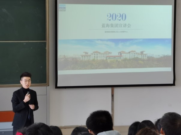 上午8:00,蓝海集团人力资源中心招聘总监李淼为18级和19级学生进行了企业宣讲,主要介绍蓝海集团现状、集团发展史、蓝海集团文化以及集团自己的相关产业等,还特别提出了蓝海的管培生计划和实习生薪资待遇问题。同学们仔细聆听,受益匪浅,更是了解和学习到了很多关于蓝海集团企业与就业方面的知识。