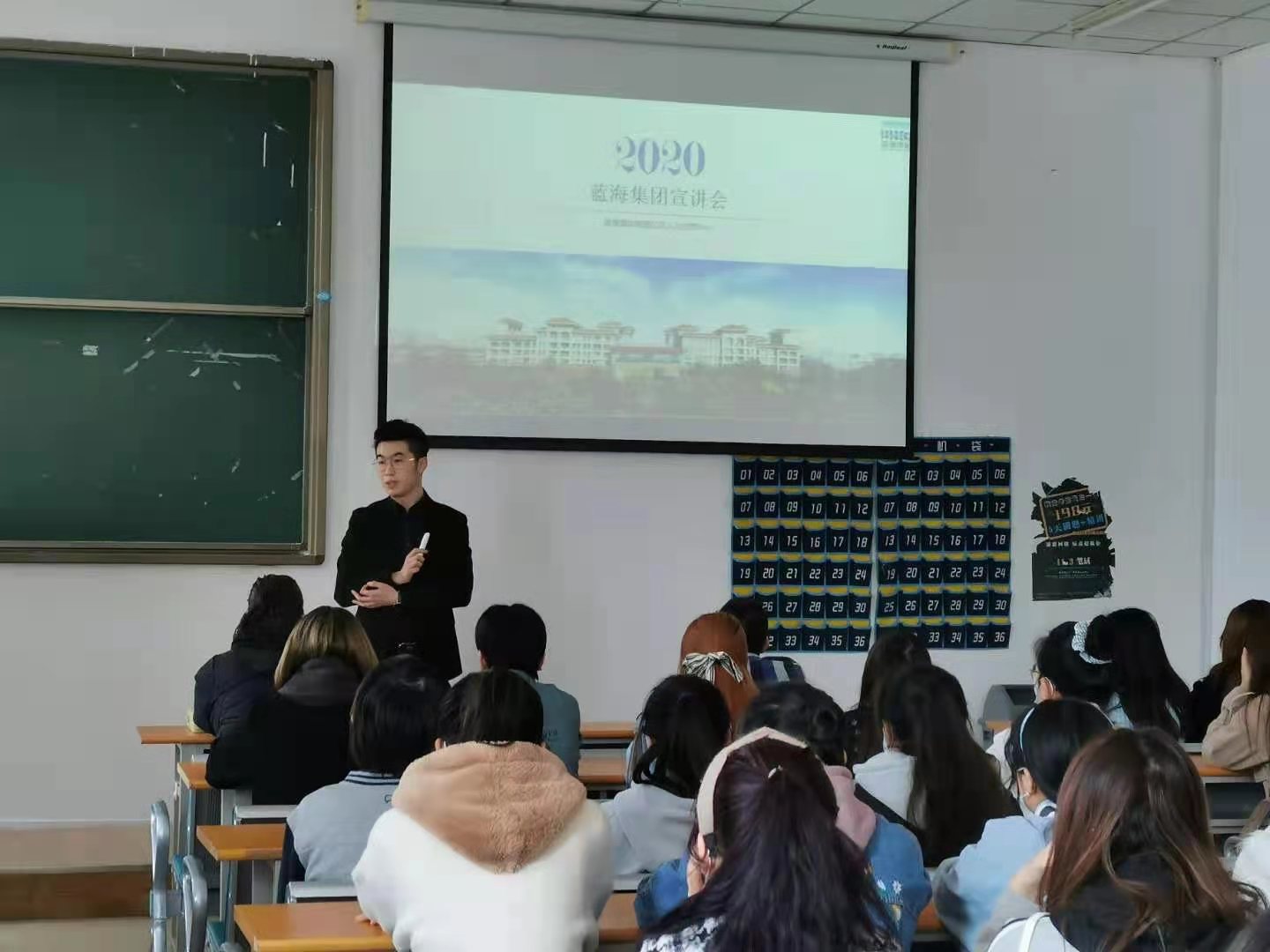 随后,在旅游管理系实训室举行了2018级旅游管理专业实习宣讲,此次宣讲由必威西汉姆官网平台院2019届酒店管理专业优秀毕业生崔宝迪同学来主持,他详细介绍了蓝海集团发展历史并对这次实习生招聘要求进行说明,随后有意向去蓝海集团实习的同学进行了现场岗位面试。下午的议程有:在主楼115举办了面向2019级旅游管理专业学生的蓝海精英班宣讲。李淼总监详细介绍了和回顾了2018级蓝海精英班的全部过程,学生对蓝海精英班有了直观认知。随后又对本次蓝海精英班组建的要求进行了说明,学生也对感兴趣的问题进行了提问。下一步我们将着手进行蓝海精英班进行组建,班建采用学生自愿报名和企业考核形式,为2019级蓝海精英班开班做好准备。同时,蓝海集团还参与了在图书馆举办的bw必威西汉姆联春季校园招聘会,为我校学生就业提供了较多的较好的岗位。