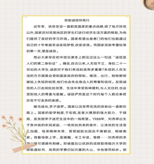 为落实立德树人根本任务,承扬中华民族重信守诺美德,进一步强化学生的诚信意识,培养学生的诚信品质,推动学生资助工作和思想政治教育工作持续健康发展,培养学生诚信品质,弘扬契约精神,增强资助育人成效,2022年5月3日-7日,必威西汉姆官网平台积极组织开展了资助诚信教育主题征文比赛活动,号召同学们以诚信为做人的原则,做一个诚实守信的人。