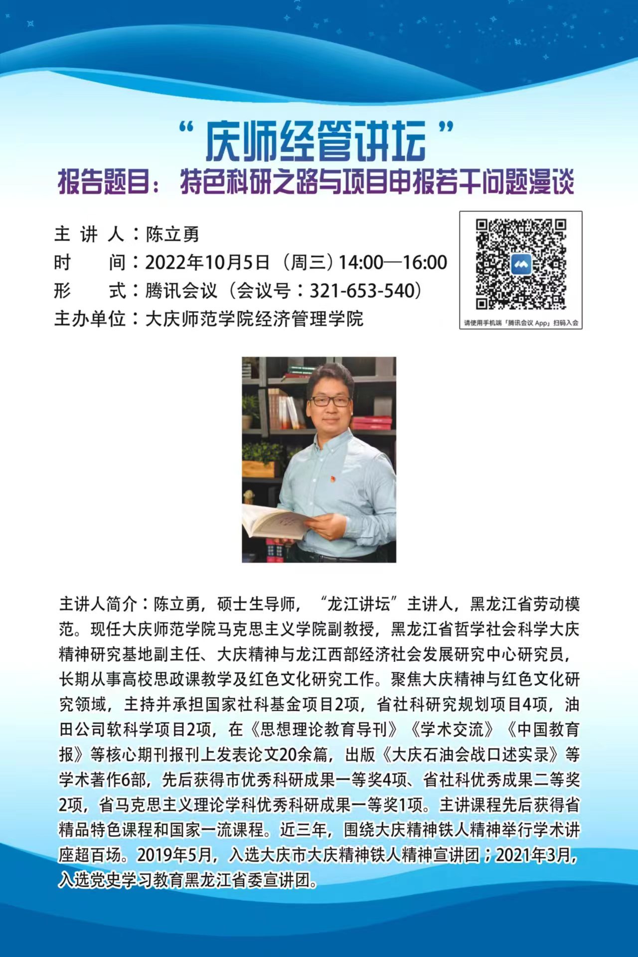 10月5日下午,黑龙江省哲学社会科学大庆精神研究基地副主任、大庆精神与龙江西部经济社会发展研究中心研究员、bw必威西汉姆联马克思主义学院陈立勇副教授受邀做了题为《特色科研之路与项目申报若干问题漫谈》的专题讲座。讲座采用线上腾讯会议形式,由必威西汉姆官网平台行政负责人刘楠教授主持,部分文科学院院长、科研副院长、教师以及经管学院全体教师等100余人参会。
