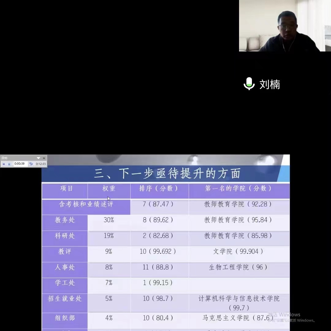 首先由学院行政负责人刘楠教授对2022年必威西汉姆官网平台工作进行总结汇报。汇报大致分为四项,第一项,工作亮点,2022年学院按计划较好完成了学校的工作任务,在党建、教学改革、科研学科建设、师资建设、就业率等方面取得工作亮点十四项,突破十项,完成或超额完成增值性评价指标十五项。第二项,主要工作开展情况,刘楠教授对党建思政建设、教育教学改革、科研社会服务、师资队伍建设以及就业体系建设五个方面进行汇报。第三项,下一步亟待提升的方面,刘楠教授制作年终统计表将权重较大的考核项目一一列出,分析学院与其他兄弟院系间存在的差距,表示下一步将对标短板,再创佳绩。经分析总结,亟待提升的主要有以下三个方面,第一,课程建设水平亟待提升,需填补省级课程五大类方面的空白;第二,专任教师师资力量亟待加强,需补充专任教师数量;第三学科建设亟待突破,需调动教师参与科研、社会服务积极性。第四项,2023年工作思路汇报,第一步将继续深入学习领会党的二十大精神和习近平谈治国理政(第四卷)将在加强师德师风建设、落实意识形态工作责任制、落实党建工作责任制、规范“三会一课”制度和党内组织生活方面有新要求。第二步是对标对表普通高校专业质量、一流专业和专业论证标准,进一步补短板、抓落实,通过全面推进与重点扶持相结合、教学工作坊、学科竞赛重面强制、以银行班创业班等特色行业班为引领,助力创新创业学院特色。第三步是以打造高层双师双能型师资队伍为目标,引进人才,用好、留住人才;加强带头人培养;鼓励提升学历和参与实践锻炼,以提升教师综合实践能力。第四步是围绕旅游管理硕士点建设,继续强化有组织科研,完善激励机制、凝聚科研资源、强化内涵建设。第五步是强化就业指导、针对服务、持续跟踪、就业包保,引导学生树立积极正确的择业观和就业观,目标是2023届毕业生就业率高于学校平均水平。
