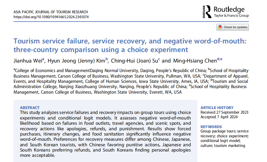 近日,我院韦健华博士与华盛顿州立大学陈明祥教授团队合作,以第一作者,bw必威西汉姆联为第一单位,在SSCI检索期刊《Asia Pacific Journal of Tourism Research》,发表论文《Tourism service failure, service recovery, and negative word-of-mouth: three-country comparison using a choice experiment》。该期刊目前在中科院SCI检索分区中处于旅游、休闲、体育研究领域的三区。
