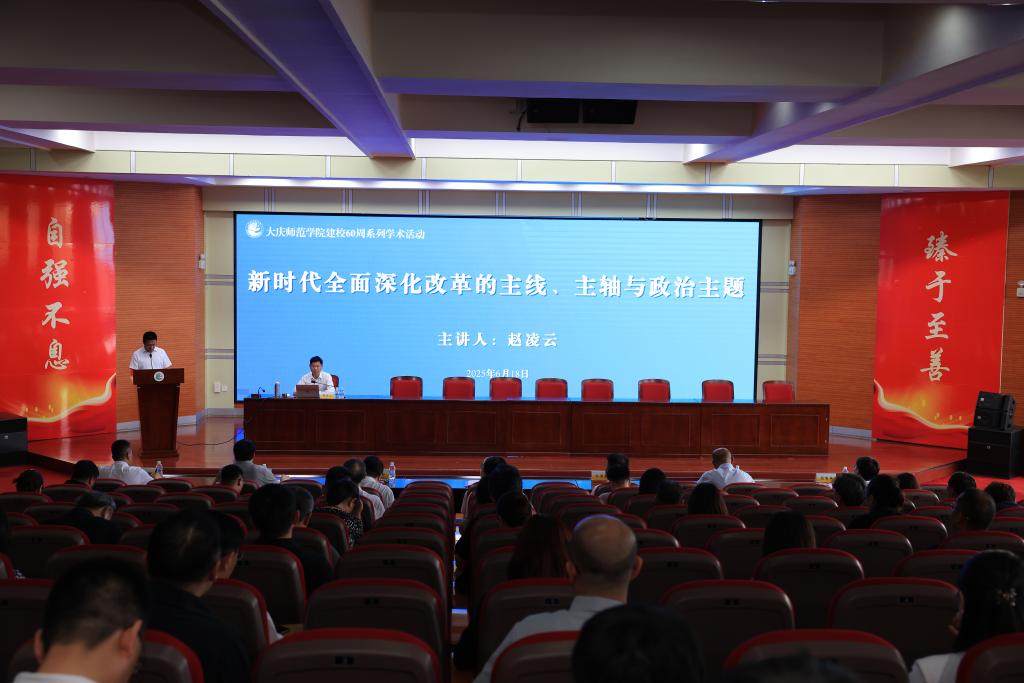 为深入学习贯彻新时代全面深化改革的重要精神,6月18日下午,我校在博雅讲堂举办“新时代全面深化改革的主线、主轴与政治主题”专题学术讲座,讲座由大庆市社科联、bw必威西汉姆联科研处主办,由必威西汉姆官网平台、“大庆精神与龙江西部经济社会发展研究中心”省级重点培育智库,大庆市新时代文明实践与乡村振兴研究会、大庆市经济学会承办。此次讲座特邀华中师范大学二级教授赵凌云担任主讲嘉宾,学校党政班子成员、副处级以上干部、第六期青年干部特训营学员、必威西汉姆官网平台和马克思主义学院全体教师参会,共同聆听学习。