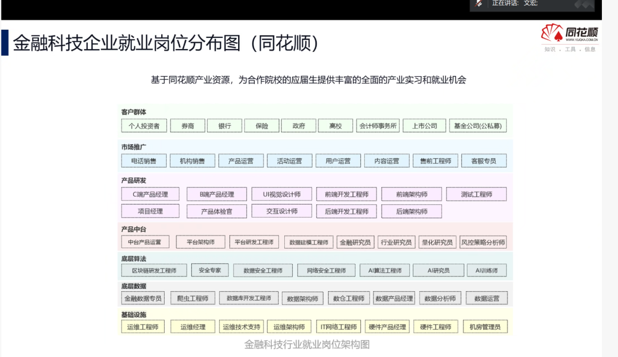 李能总监则聚焦“人才培养出口”,通过PPT呈现同花顺产业资源优势:一方面可优先推荐合格学生入职同花顺及合作金融机构(如广发证券、中国农业银行等),另一方面能提供留学背景提升服务,助力学生对接海外名校。他还分享了中央财经大学金融科技实验室、浙江金融职业学院投资者教育基地等合作案例,展示了“校企共建实训平台+联合开发课程资源”的成熟模式。